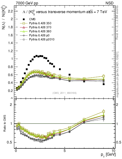 Soft QCD (nsd only) : Identified Particles : Ratios : Λ/K0S vs pT